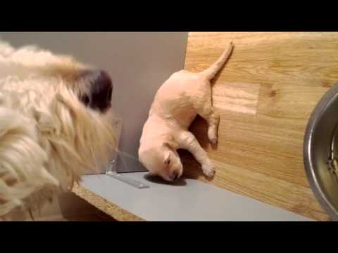 The puppies are growing so quickly. There eyes were all open as of Day 14. We have nicknamed the white curly one Curly Sue, but she is the only one we've named. She is such a sweet little girl so far and loves to snuggle. They are starting to move around a lot more and are learning how to walk. One even dunked her nose in Maia's water bowl.